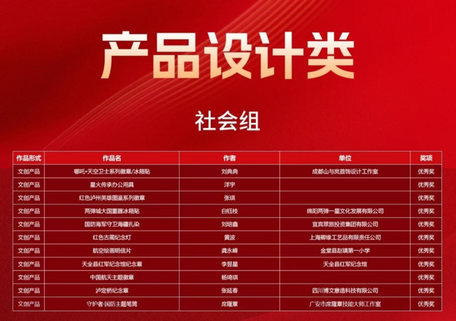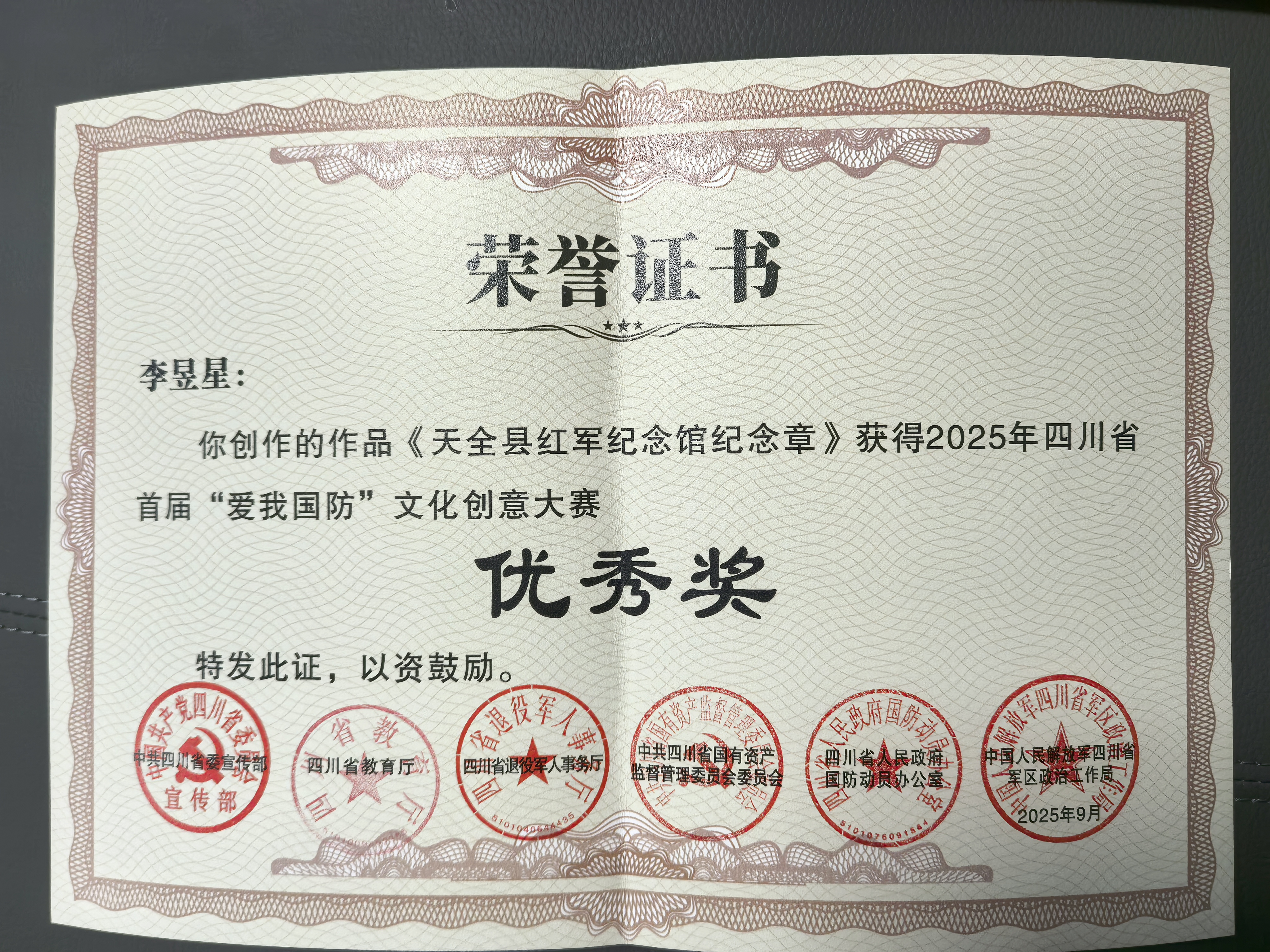近日,四川省首届“爱我国防”文化创意大赛发布活动在宜宾李庄镇圆满落幕,本次大赛以“文创绘华章 忠诚筑国防”为主题,由省委宣传部、省教育厅、省军区政治工作局等六部门联合主办,天全县红军纪念馆选送的纪念章作品荣获产品设计类优秀奖。