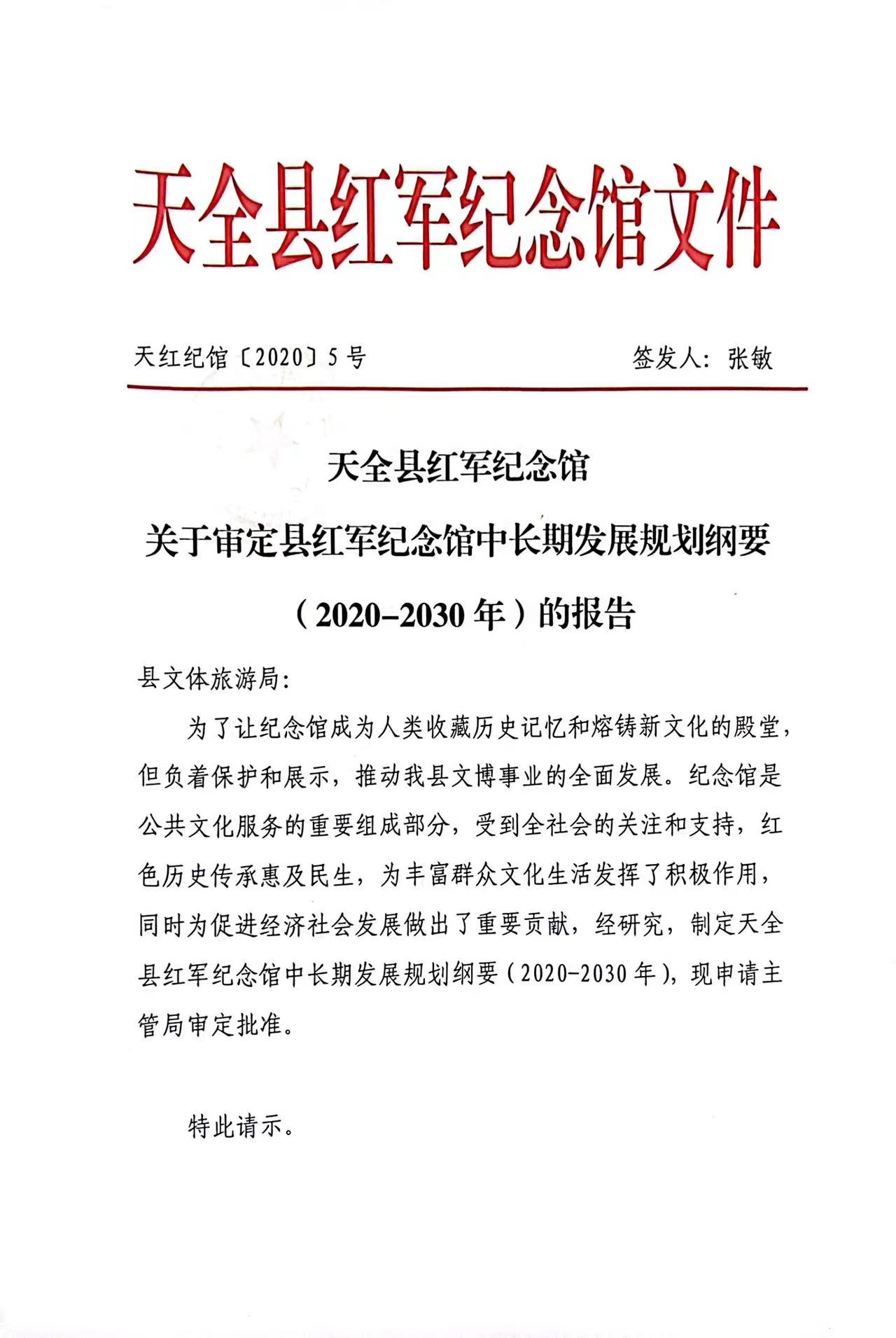 天全县红军纪念馆关于审定县红军纪念馆中长期发展规划纲要(2020-2030年)的报告