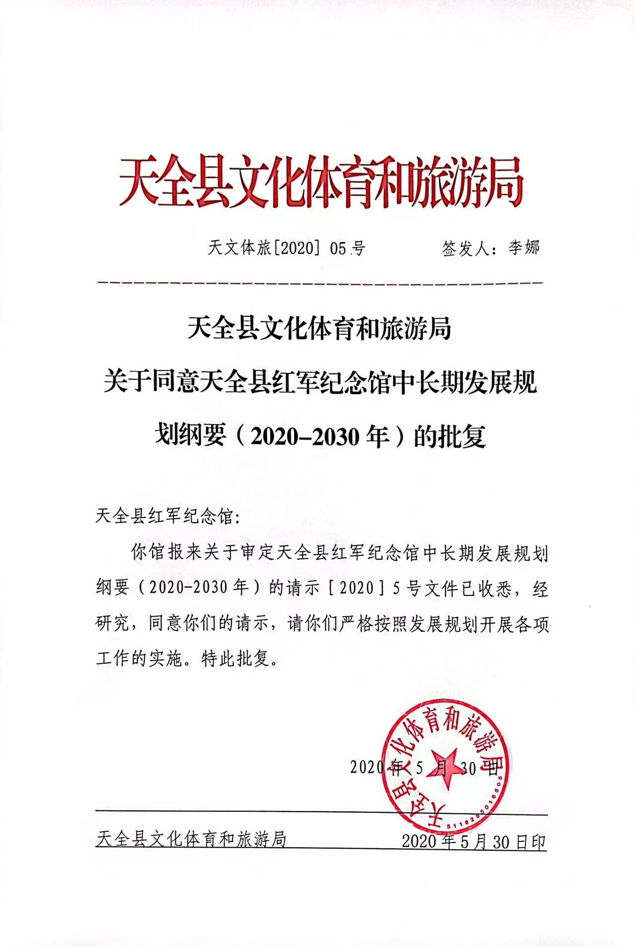 天全县文化体育和旅游局关于同意天全县红军纪念馆中长期发展规划纲要(2020-2030年)的批复